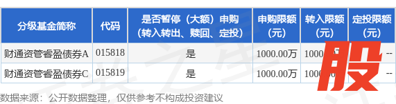 本站消息创赢策略,6月17日财通证券资产管理有限公司发布《财通资管睿盈债券型证券投资基金暂停大额申购、转换转入、定期定额投资业务公告》。公告中提示,为维护财通资管睿盈债券型证券投资基金的稳定运作,保护基金份额持有人的利益,自2025年6月17日起财通资管睿盈债券型证券投资基金暂停大额申购、转换转入、定期定额投资业务,申购、转换转入上限金额为1000.0万元,下属分级基金调整明细如下: